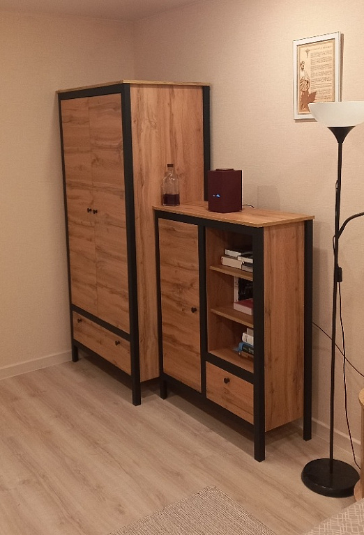 Контрастное сочетание цветов (дуб вотан/черный), легкая и функциональная конструкция элементов, металлические комплектующие - отличительные особенности коллекции LOFT.