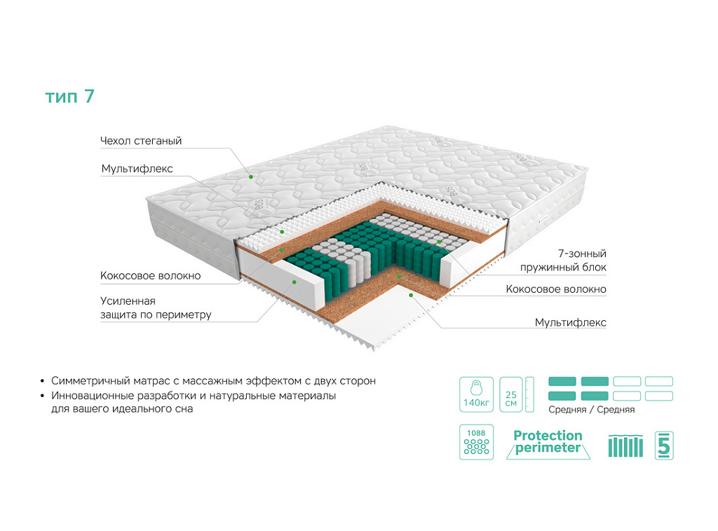 | Материал | Блок независимых пружин, Чехол, Кокосовое волокно, Мультифлекс, Усиление по периметру матраса |