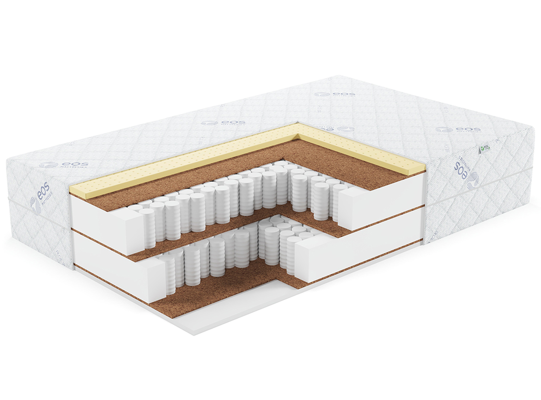 | Материал | Латекс, Блок независимых пружин, Чехол, Войлок, FoamLux, Кокосовое волокно, Латексированная кокосовая плита, Усиление по периметру матраса |