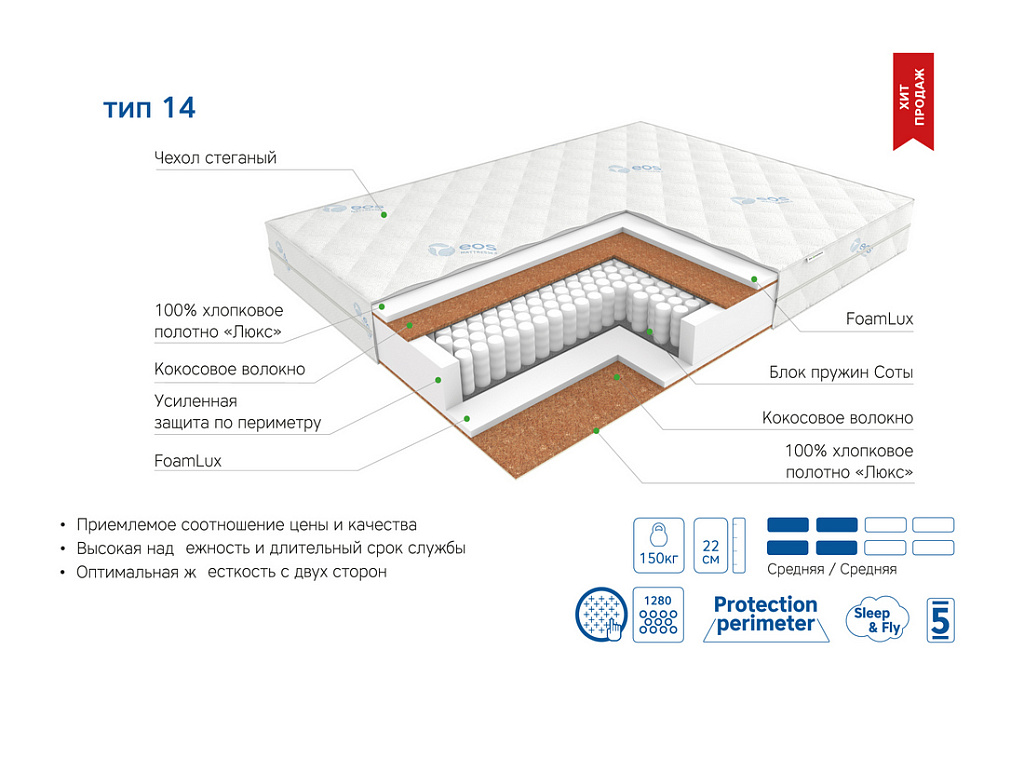 | Материал | Блок независимых пружин, Хлопковое полотно, FoamLux, Кокосовое волокно, Усиление по периметру матраса |