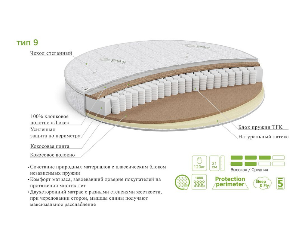 | Материал | Латекс, Блок независимых пружин, Хлопковое полотно, Чехол, Латексированная кокосовая плита, Усиление по периметру матраса |