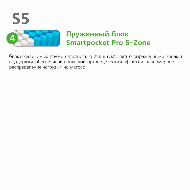 | Smartpocket PRO 5-Zone | Усовершенствованный блок независимых пружин Smartpocket плотностью размещения 256 пружин на м2. Каждая пружинка упакована в отдельный чехол и работает самостоятельно, отдельно, независимо от других пружин в блоке. Такой блок принимает форму тела спящего на матрасе - в этом и заключается ортопедический эффект. Усиление ортопедического эффекта происходит благодаря пяти выраженным зонам поддержки, которые равномерно распределяют нагрузку на матрас для более комфортного и здорового сна. |