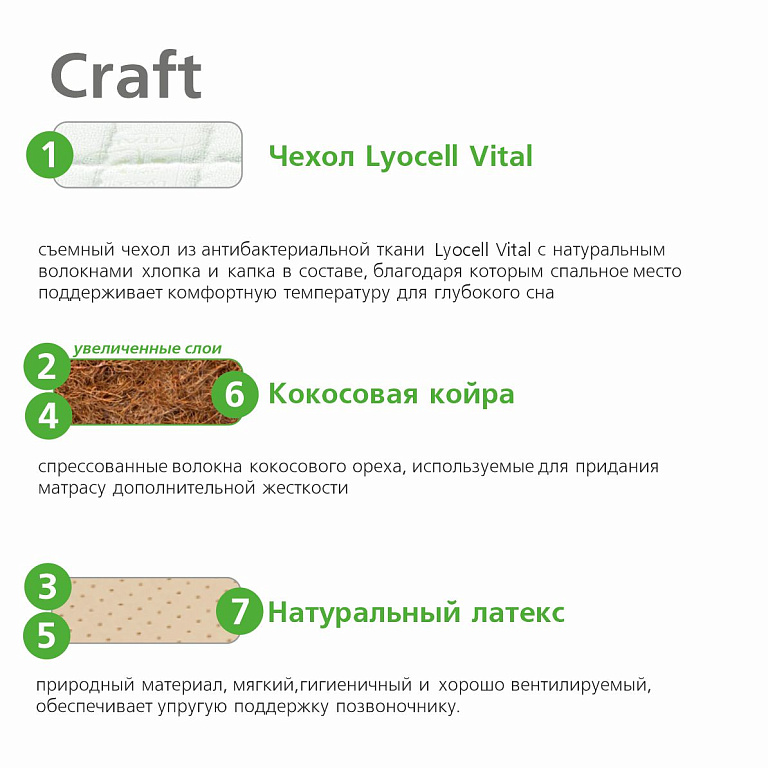 Натуральный материал, состоящий из спрессованных волокон кокосового ореха, полностью пропитанных латексом. Слои из прочной и долговечной кокосовой койры используются для придания матрасу дополнительной жесткости. |