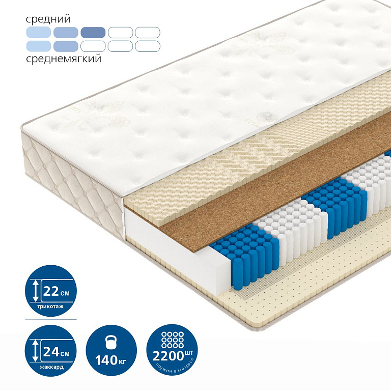 | Medizone R2200 | Блок независимых пружин из закаленной стали с выраженными зонами. Сбалансированное распределение зон по длине матраса наиболее эффективно учитывает анатомию тела человека. Уникальная центральная зона обеспечивает поддержку людей разного роста. Диаметр пружины 40 мм. Высота пружинного блока 140 мм. |